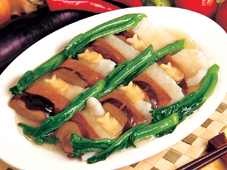 4. 石斑以醃料醃20分鐘,並依序排好,每片石斑中間夾一片火腿、冬菇及甘筍,排好落碟蒸5分鐘。